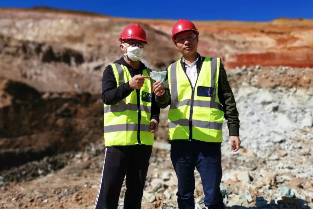 黃星(右)赴非洲出差時,和同事在當?shù)氐V山留影